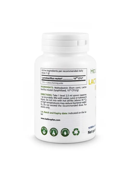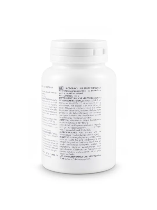 This product provides Lactobacillus reuteri in powder form, offering a simple and flexible alternative to capsules. The powder can be easily mixed with water, juice, or other lukewarm beverages and allows convenient daily use. The capsule-free format avoids unnecessary excipients and provides a clean and minimal composition.