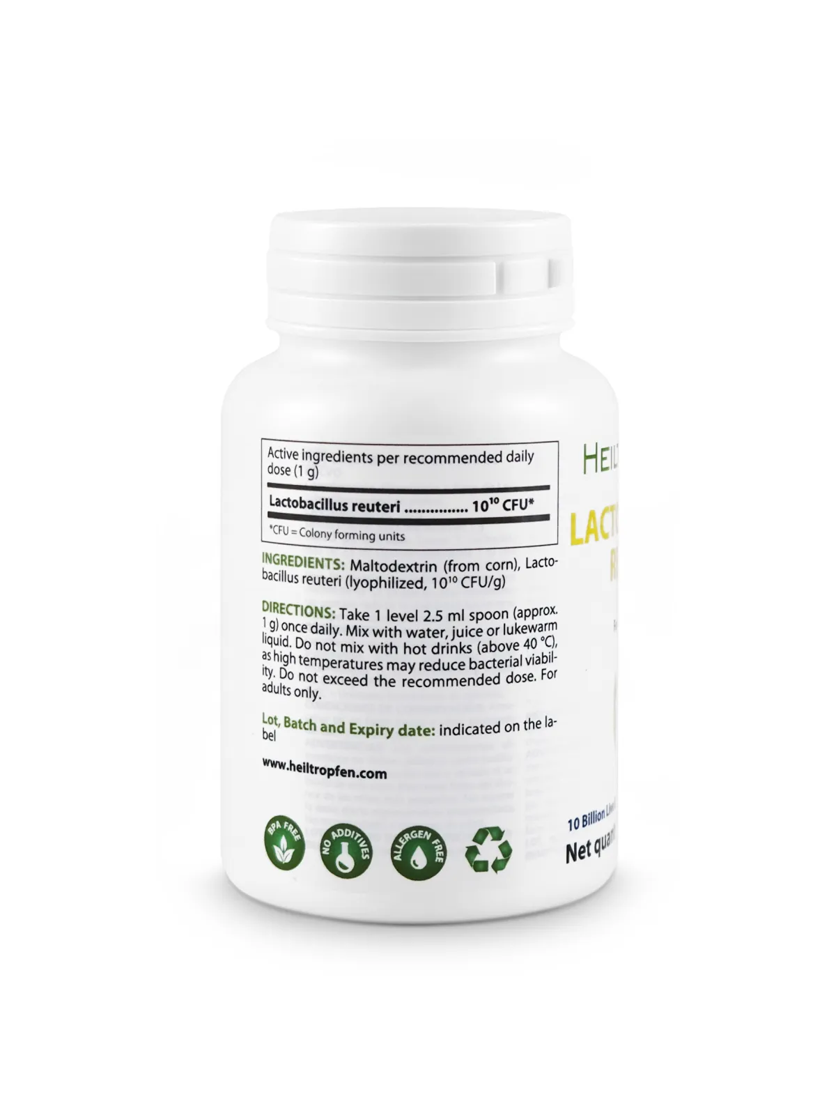 DIRECTIONS: Take one level 2.5 ml measuring spoon (approximately 1 g) once daily. Mix the powder with water, juice, or another lukewarm beverage. Do not mix with hot drinks (above 40 °C), as high temperatures may reduce bacterial viability. Do not exceed the recommended daily dose. For adults only.