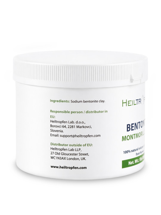 Bentonita montmorillonita: mineral procedente de cenizas volcánicas con un alto poder aglutinante. Tiene una gran capacidad de unión y aumenta su superficie en contacto con el agua. Esto da como resultado una capacidad de absorción inusualmente alta para las sustancias depositadas. Tiene un contenido de montmorillonita de al menos el 95 %. Capacidad de unión muy alta para todo tipo de contaminantes. Une metales pesados y también puede unir elementos radiactivos. Ingredientes: aquí el análisis químico de la bentonita; [%] SiO2 59,50, TiO2 0,97, AL2O3 14,90, Fe2O3 6,80, MnO 0,023, MgO 2,10, CaO 0,46, Na2O 0,80, K2O 1,40, F <0,0, superficie específica. 170 m² / g, humedad aprox. 5 %, minerales excepto montmillonita: moscovita, caolinita/clorita, glauconita, cuarzo, feldespato, carbonato, pirita. Se nos ha señalado que la fecha de caducidad de nuestros productos puede resultar confusa, ya que se indica con dos dígitos para el mes y el año. Por ejemplo, 11/31 es noviembre de 2031. La producción se trasladó de Noruega a Alemania. Todavía se puede adquirir bentonita de Noruega.