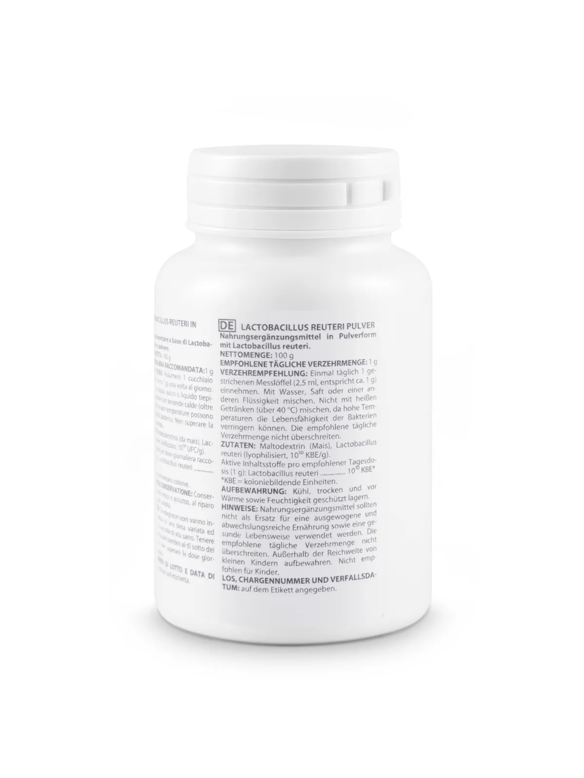 Este producto proporciona Lactobacillus reuteri en polvo, ofreciendo una alternativa sencilla y flexible a las cápsulas. El polvo se puede mezclar fácilmente con agua, zumo u otras bebidas tibias, lo que permite un uso diario cómodo. El formato sin cápsulas evita excipientes innecesarios y ofrece una composición limpia y mínima.