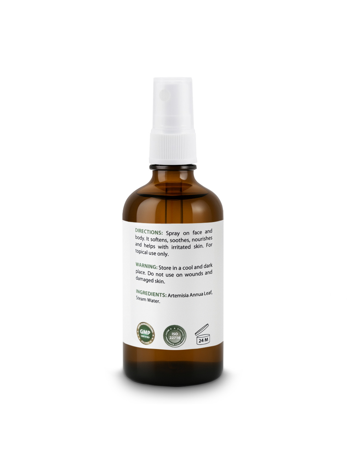 Puhdas hydrosoli – hydrolatti, jossa on 100 % luonnollisia ainesosia. Makean koiruohon hydrosoli – hydrolatti kosteuttaa, virkistää ja rauhoittaa ihoa. Käyttöohjeet: suihkuta kasvoille ja vartalolle. Se pehmentää, rauhoittaa, ravitsee ja auttaa ärtynyttä ihoa. Vain paikalliseen käyttöön. Varoitus: Säilytä viileässä ja pimeässä paikassa. Älä käytä haavoilla tai vaurioituneella iholla. Ainesosat: Artemisia Annua -lehti, höyryvesi.