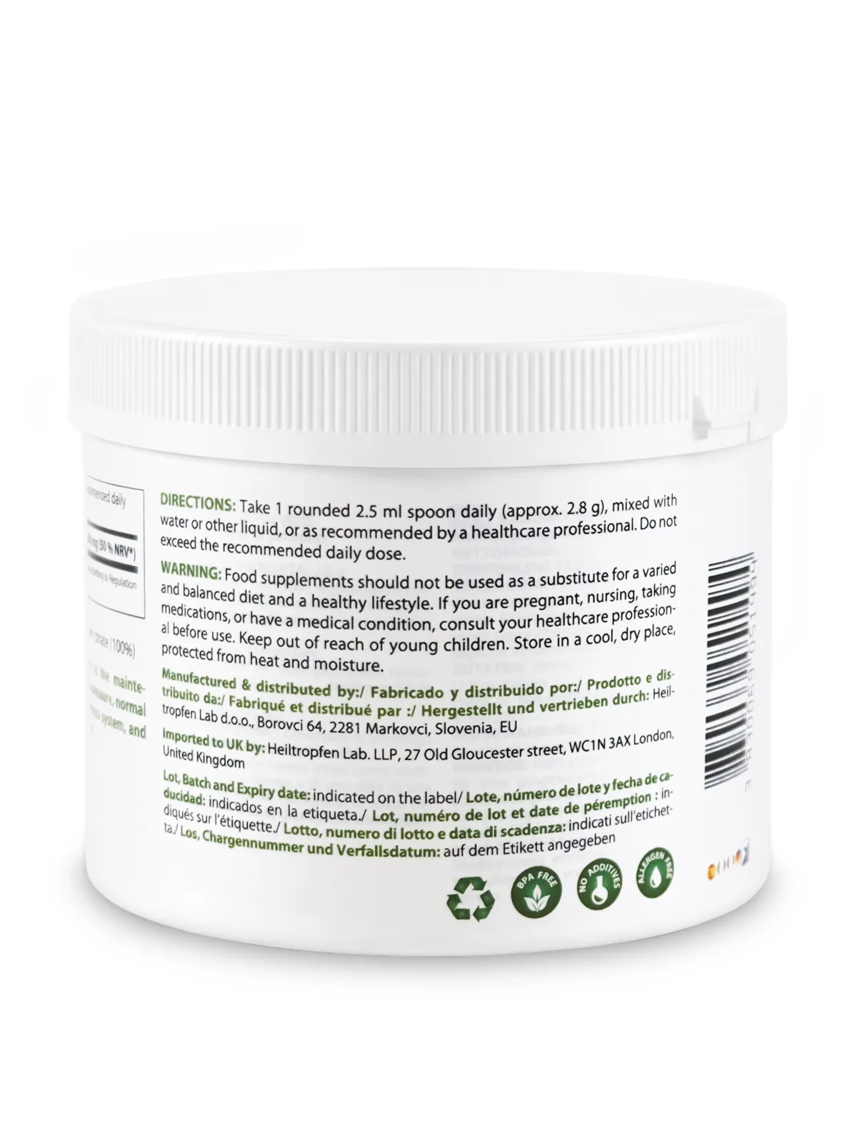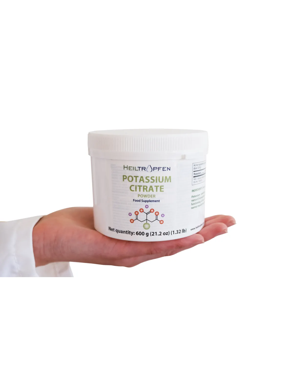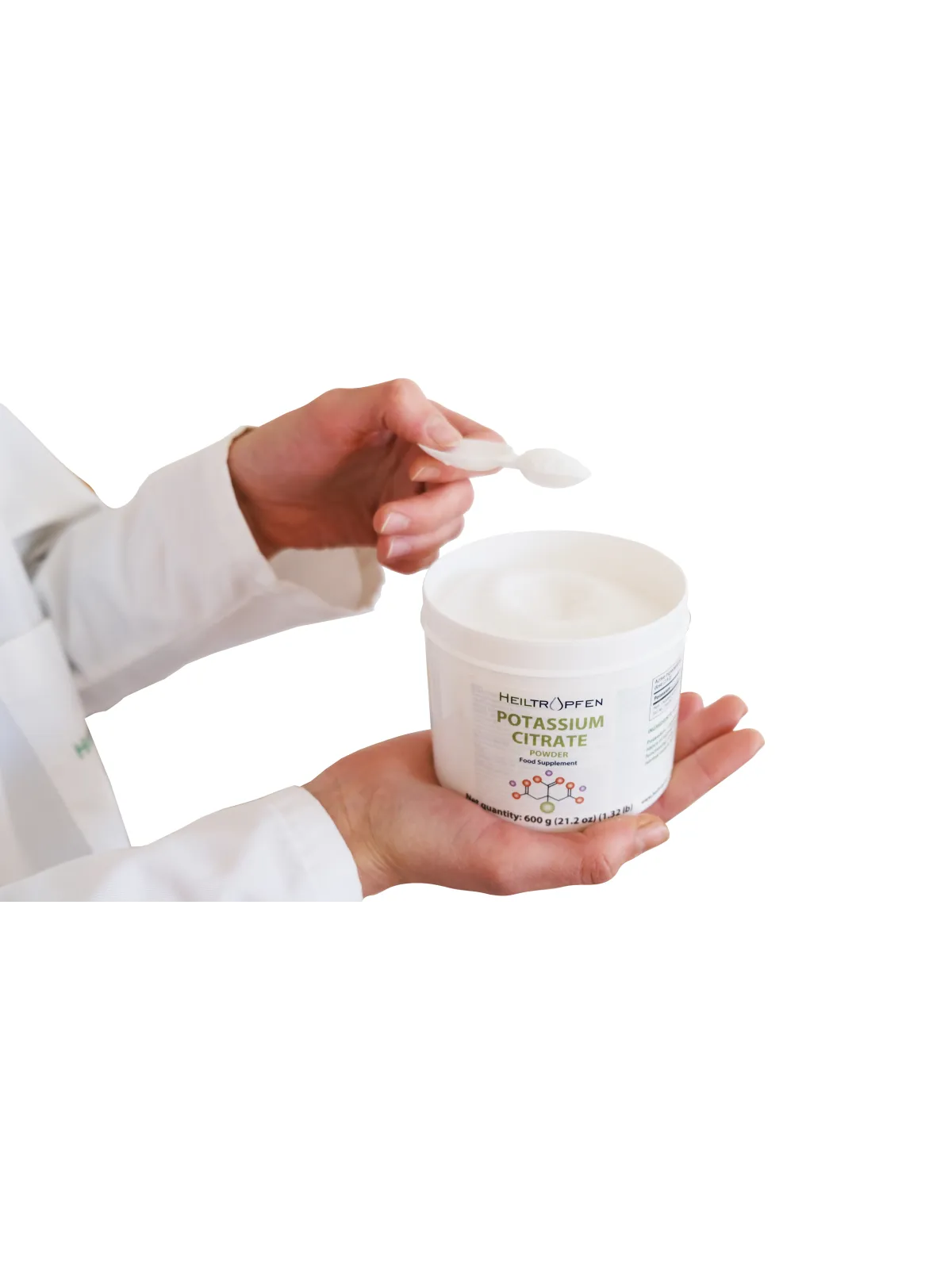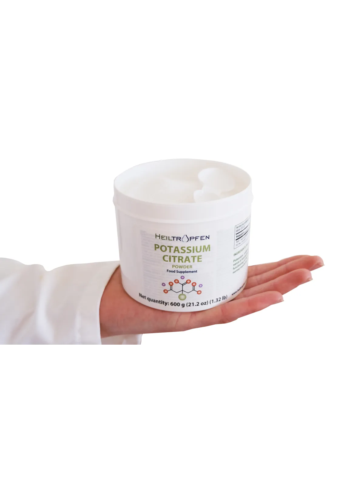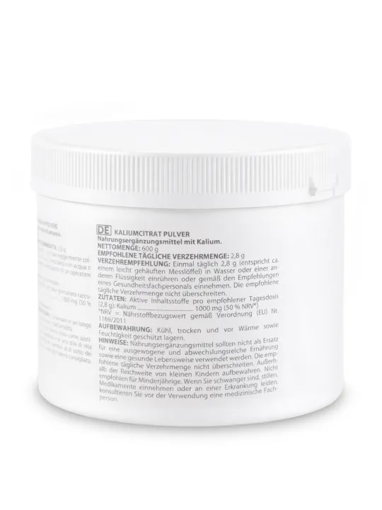 Jauhemuoto mahdollistaa tarkan ja joustavan annostelun, ja se liukenee helposti veteen tai muihin sopiviin nesteisiin. Kaliumsitraatti on ainoa ainesosa, joten koostumus on puhdas, lisäaineeton ja allergeeniton, tarjoten suoraviivaisen ja läpinäkyvän sisällön.