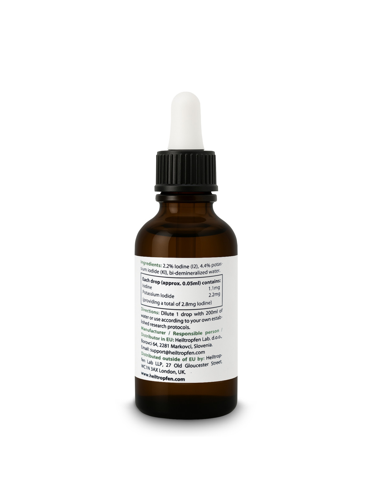 Favorise le bien-être général : l'iode joue un rôle essentiel dans le maintien de la fonction immunitaire, de la santé de la peau et des fonctions cognitives. Cette solution est un moyen facile de garantir un apport adéquat en iode, particulièrement important dans les régimes alimentaires où les sources d'iode sont limitées. Ingrédients de haute qualité : nous n'utilisons que des ingrédients de la plus haute qualité, garantissant la pureté et la puissance de l'iode. Notre solution est exempte d'additifs artificiels, ce qui en fait un choix naturel pour vos besoins en matière de compléments alimentaires. Facile à utiliser : la solution est conditionnée dans un flacon compte-gouttes de 30 ml pour un dosage pratique. Conformité GPSR Distributeur mondial Heiltropfen Lab, LLP UK 27 Old Gloucester Street, WC1N 3AX Londres, Royaume-Uni