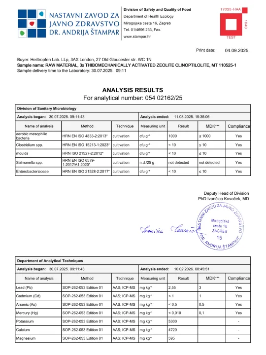 La zéolite clinoptilolite n'est actuellement approuvée dans l'UE que comme additif alimentaire pour animaux, anti-agglomérant et liant, et est déclarée sous les codes E567 et E568. Aux États-Unis, les zéolites sont enregistrées comme sans danger pour l'homme par la FDA (Food and Drug Administration) sous le code (CFR 21) 182.2727.