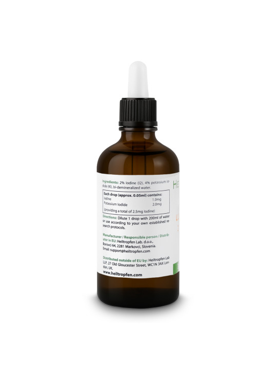 Upotrijebljeni jod dolazi iz kristala rudnih izvora, a ne iz školjkaša ili alg. Uvijek svjež. Ne istječe. Čuvati na sobnoj temperaturi. Štititi od izravne sunčeve svjetlosti. Prirodni pročišćivač vode, otopina se sastoji od 85% destilirane vode, 10% kalijevog jodida i 5% joda. Kao pročišćivač vode dodajte 4-7 kapljica po litri vode.