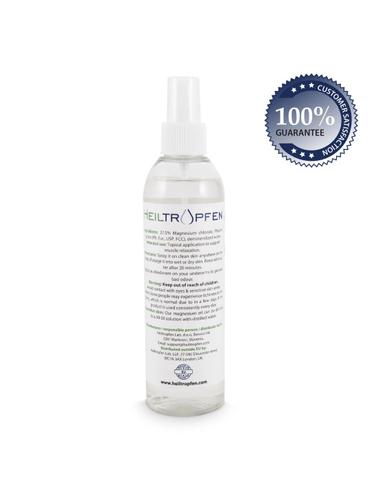 Ez az oldat magnézium-klorid-hexahidrátból (Ph. Eur., USP, FCC, élelmiszeripari minőség) és kétszer desztillált vízből készül. A feltüntetett koncentráció az oldatban található magnézium-klorid tartalmára vonatkozik, tömegszázalékban kifejezve. Minden uncia Pure Magnesium Oil termékünk 3182 mg elemi magnéziumot tartalmaz (538 mg teáskanálonként), ami 8 permetezésenként körülbelül 215 mg elemi magnéziumot jelent. Tartalom: min. 27,5% MgCl2. 100%-os kockázatmentes elégedettségi garanciánk az áru átvételétől számított 30 napig érvényes. Ha bármilyen okból nem vagy teljesen elégedett a termékkel, egyszerűen küldd vissza nekünk, és mi visszatérítjük a pénzedet – minden kérdés nélkül. A garancia egy termékre érvényes. Az összes többi terméket bontatlan és fel nem használt állapotban kell visszaküldeni.