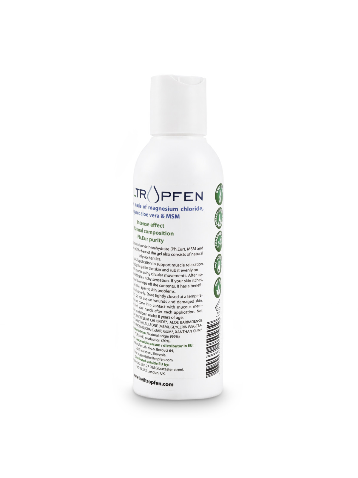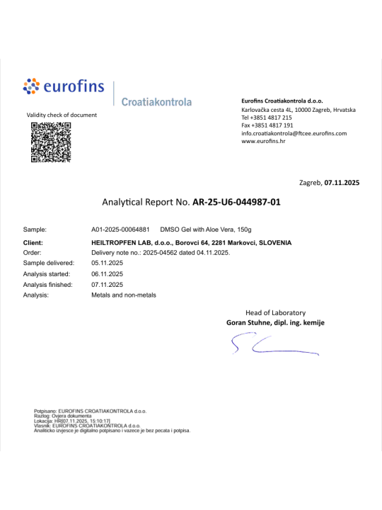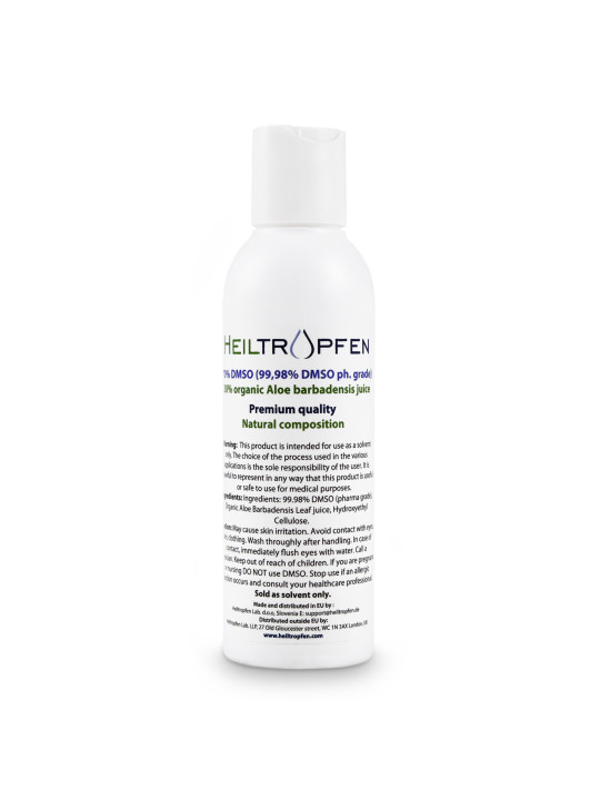 Ingredienti: DMSO puro al 99,98% (ingredienti di grado farmaceutico), succo di foglie di Aloe Barbadensis biologico, idrossietilcellulosa. Attenzione: può causare irritazione cutanea per alcuni minuti. Evitare il contatto con gli occhi e gli indumenti. Lavarsi accuratamente dopo l'uso. In caso di contatto con gli occhi, sciacquarli immediatamente con acqua. Consultare un medico. Questo prodotto è destinato esclusivamente all'uso come solvente. La scelta del processo utilizzato nelle varie applicazioni è di esclusiva responsabilità dell'utente. È illegale dichiarare in qualsiasi modo che questo prodotto sia utile o sicuro per uso medico.