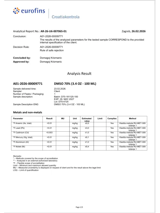 DMSO wordt al meer dan 100 jaar gebruikt in de Verenigde Staten. Het is een natuurlijke stof die wordt gewonnen uit houtpulp en is onschadelijk wanneer het met de juiste voorzorgsmaatregelen wordt gebruikt. DMSO is een organische, kleurloze, natuurlijke, niet-gesynthetiseerde vloeistof, gewonnen uit lignine. DMSO is uitsluitend bedoeld voor gebruik als oplosmiddel en de keuze om het voor andere toepassingen te gebruiken is de exclusieve verantwoordelijkheid van de gebruiker. Molecuulformule: C2H6OS Gehalte: zuiver Ph Eur (70%).