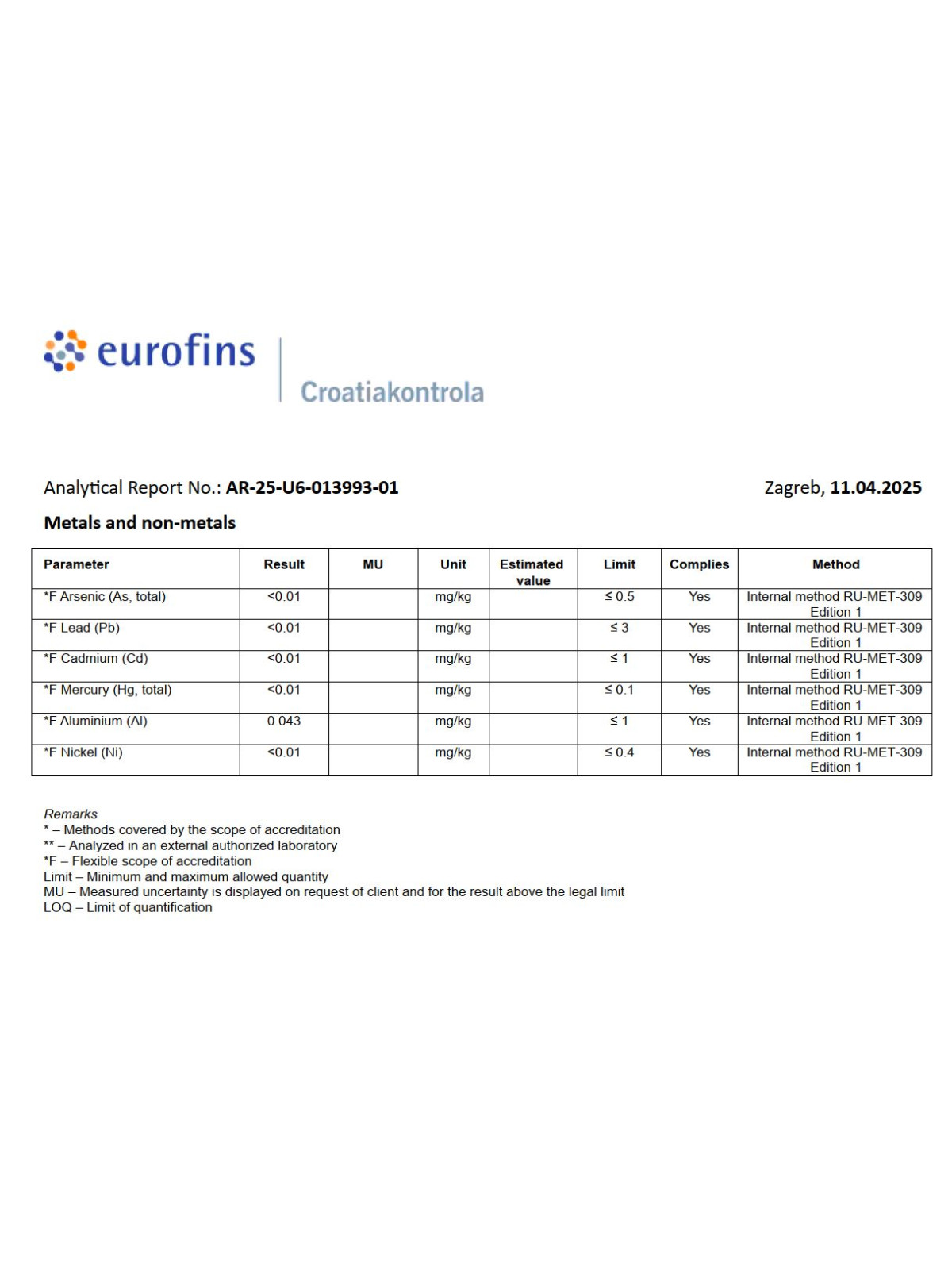 • Przetestowany przez niezależną jednostkę pod kątem zanieczyszczenia metalami ciężkimi. Na życzenie klienta dostarczamy analizę metali ciężkich.
