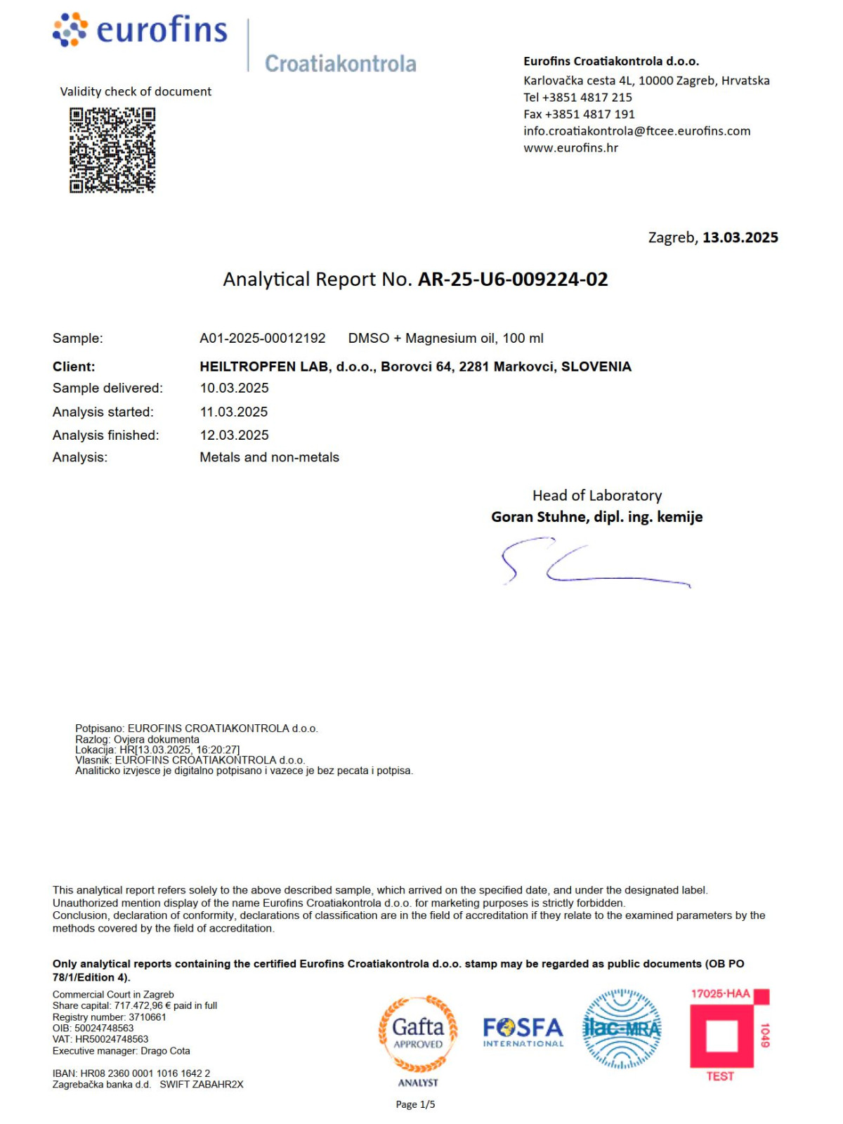 A solução de óleo de magnésio é feita de cloreto de magnésio (Ph. Eur., USP, FCC, grau alimentício) e água bidestilada. Fórmula molecular: (MgCl2). É composto por 60% de dimetilsulfóxido e 40% de óleo de magnésio. Parte do óleo de magnésio contém 4,303 mg de magnésio, o que equivale a 215,2 mg por 5 ml de solução.