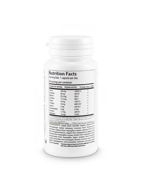 Experimente uma digestão melhorada e uma absorção de nutrientes otimizada com o nosso suplemento digestivo premium. Formulado com uma mistura abrangente de enzimas, incluindo lipase, invertase, maltase, celulase, papaína, protease, lactase, glucoamilase, amilase e bromelaína, este suplemento foi concebido para ajudar na decomposição de gorduras, proteínas, hidratos de carbono e lactose, para uma digestão suave. Ideal para quem procura alívio do inchaço, indigestão e intolerâncias alimentares, a nossa fórmula ajuda o seu corpo a processar os alimentos de forma eficiente, garantindo que tira o máximo proveito de cada refeição.