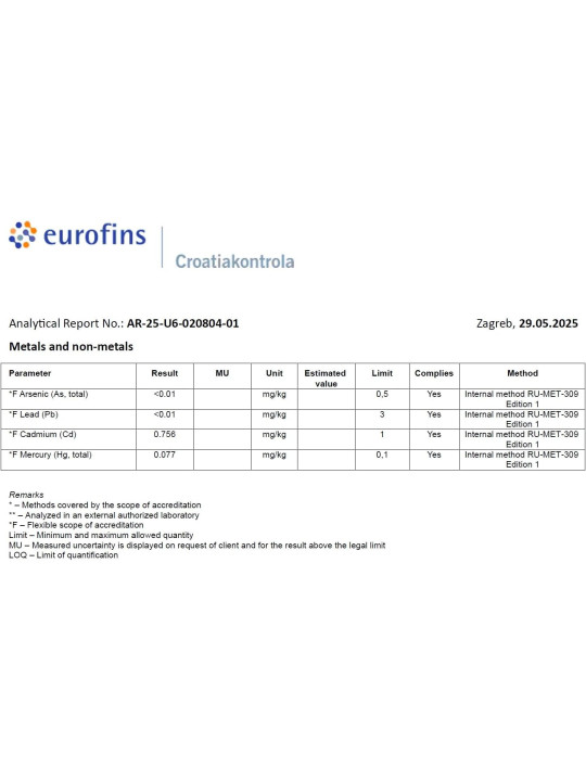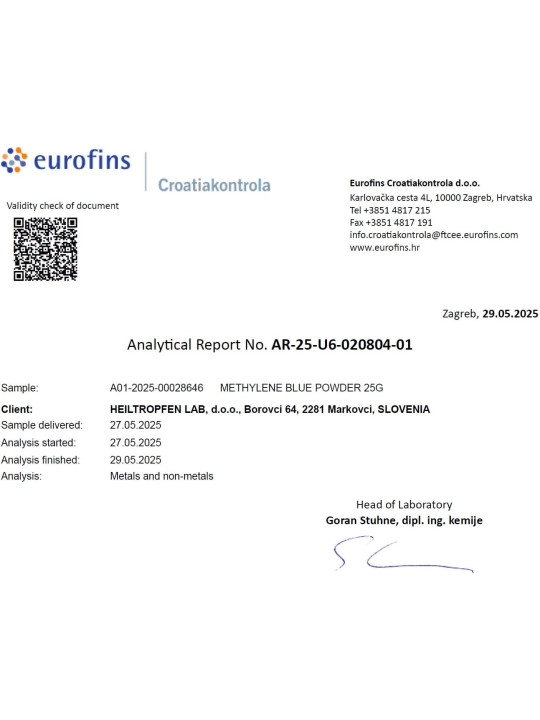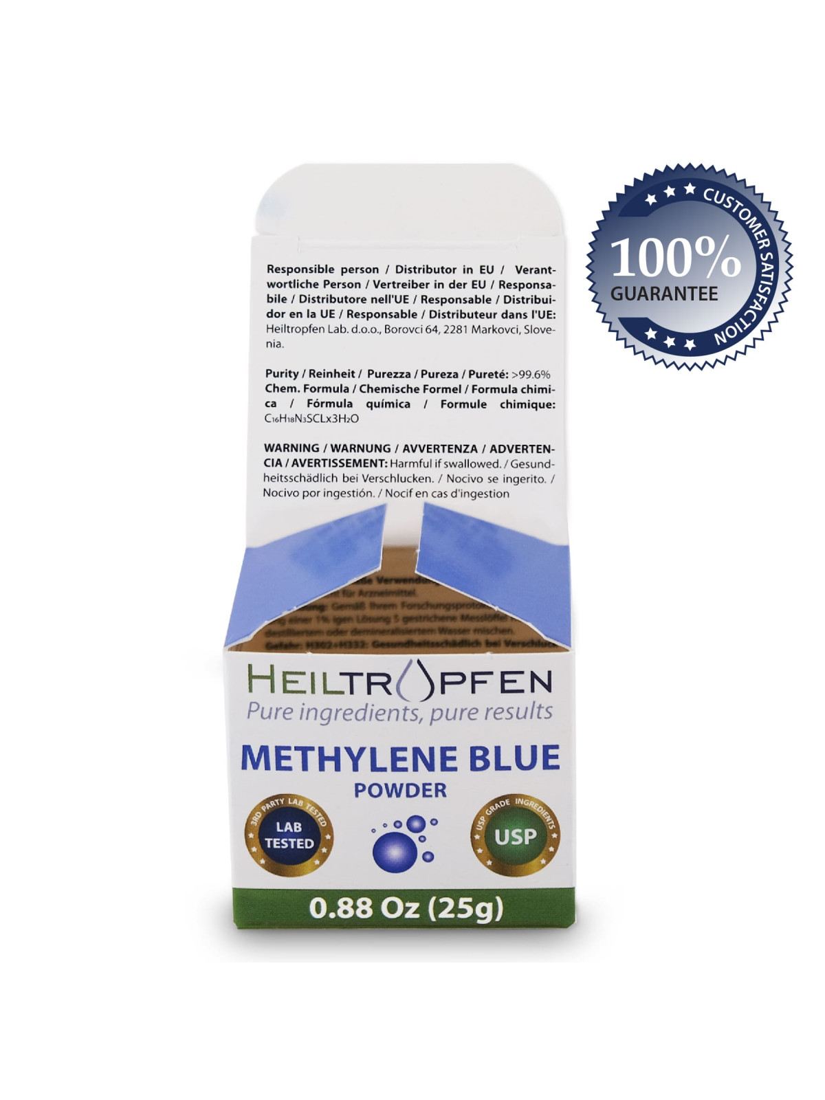 ● Testirano s strani tretje osebe za onesnaženost s težkimi kovinami. Na zahtevo vam bomo posredovali analizo težkih kovin. Naš izdelek izpolnjuje in presega zahteve USP. Neodvisna (USP) Ameriška farmakopeja je preverila metilensko modrilo, vključno s certifikatom.