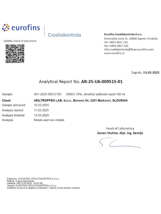 DMSO sa v Spojených štátoch používa už viac ako 100 rokov. Je to prírodná látka získavaná z drevnej buničiny, ktorá je pri správnom používaní a dodržiavaní bezpečnostných opatrení neškodná. DMSO je organická, bezfarebná, prírodná, nesyntetizovaná kvapalina extrahovaná z lignínu. Čisté DMSO s čistotou 99,9 % má kvapalný alebo pevný/kryštalický stav! Nad 18,5 °C (65,3 °F) má DMSO tekutý stav, pod touto teplotou má pevný/kryštalický stav. V prípade kryštalického stavu látky ju môžete vložiť do širokej nádoby alebo hrnca s horúcou vodou (nie vriacou) a ak je to možné, uzavrieť ju. Voda by nemala prekročiť hrdlo fľaše. Po 30–60 minútach vodu vymeňte za horúcu. Potom fľašu uchovávajte pri izbovej teplote nad bodom topenia. Môžete ju tiež umiestniť na ohrievač, kým nedosiahne tekutý stav. Po použití: fľašu pevne uzavrite (krk fľaše musí byť pred uzavretím suchý), inak môže dôjsť k rozliatiu!